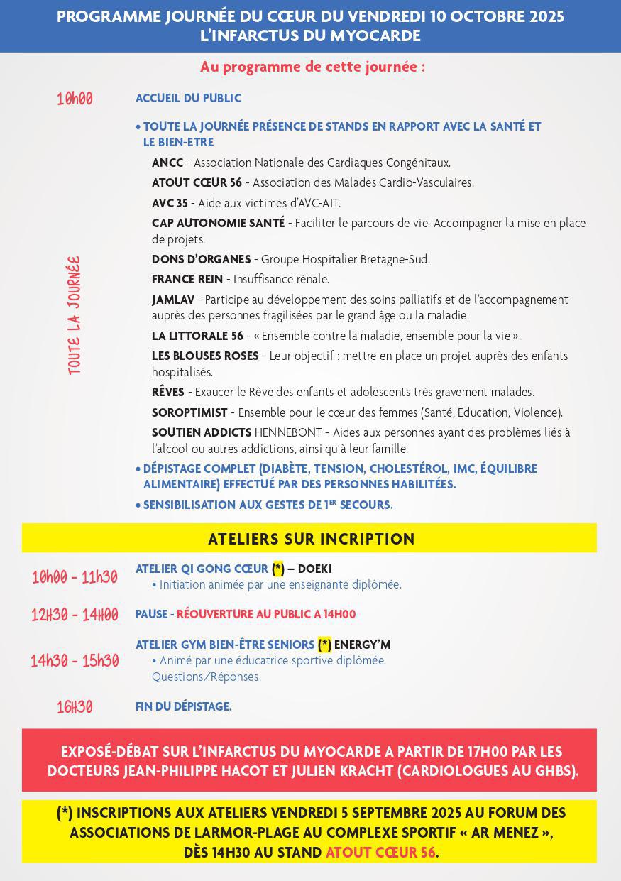 Une journée conviviale et utile pour mieux comprendre, prévenir et agir pour la santé de votre cœur organisée par Atout Cœur 56, avec le soutien de nombreux partenaires et de la Haute Autorité de Santé (HAS).